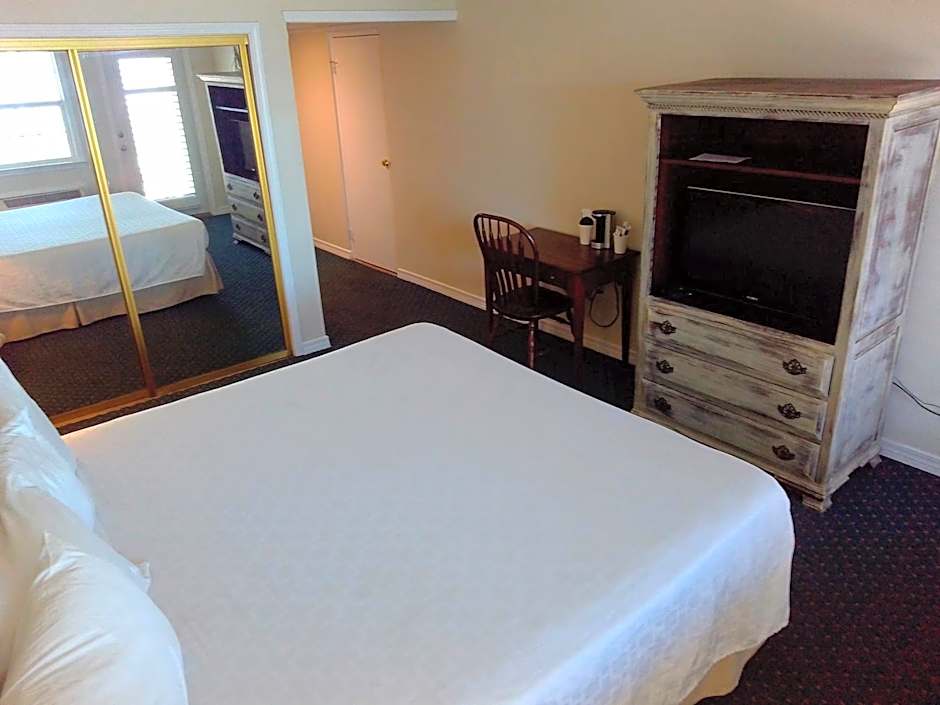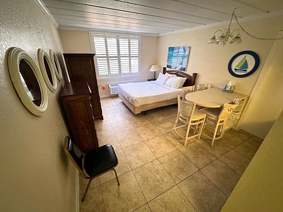 Known as the Captain's Quarters, this spacious studio offers a kitchenette with a dining area, a full bathroom, and seating area.