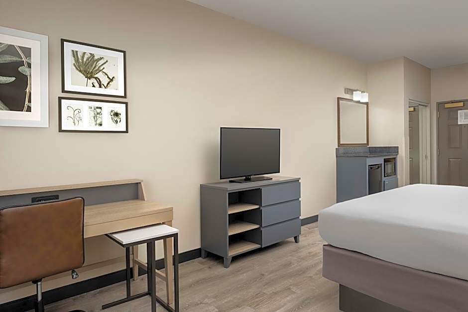 This accessible room features a flat-screen cable TV, microwave, and small refrigerator. A roll-in shower is also included.