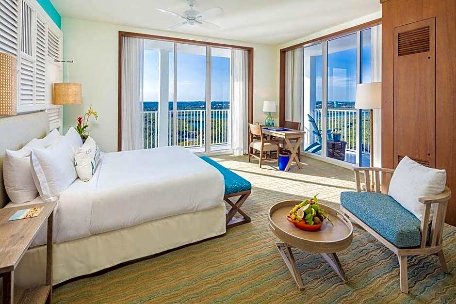 Revel in sweeping views of the Intracoastal Waterway -Nature Preserves and North Lake or South Lake views from the private oversized balcony of this spacious retreat. Our Junior Suite provides a living and sleeping area to enhance your stay. Contemporary furnishings with a soothing sand, sea and sky color palette reflect a coastal-luxe atmosphere. One king bed with luxurious all-white linens and premium bedding create the perfect setting for further relaxation after another day in paradise. A large vanity and over-sized shower add functionality to a refreshing bathroom which is highlighted with sea glass-inspired tile work. Our Junior Suites with with a king bed can accommodate up to 3 guests if you share the bed or request a rollaway bed. However, be advised that rollaway beds are not guaranteed at the time of booking and must be requested at check in. A daily fee applies.
