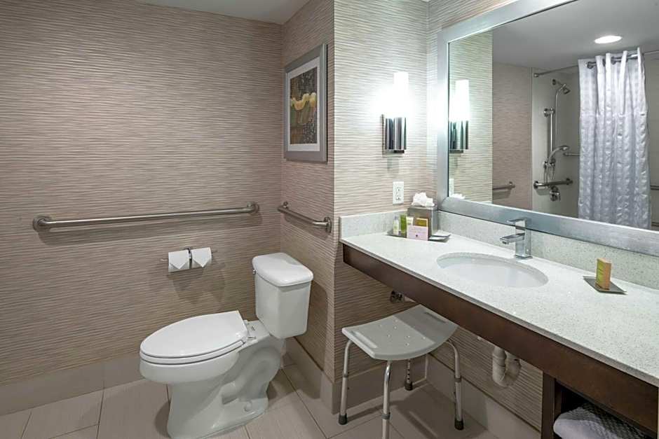 This accessible room features visual alarms and a private bathroom with a roll-in shower.