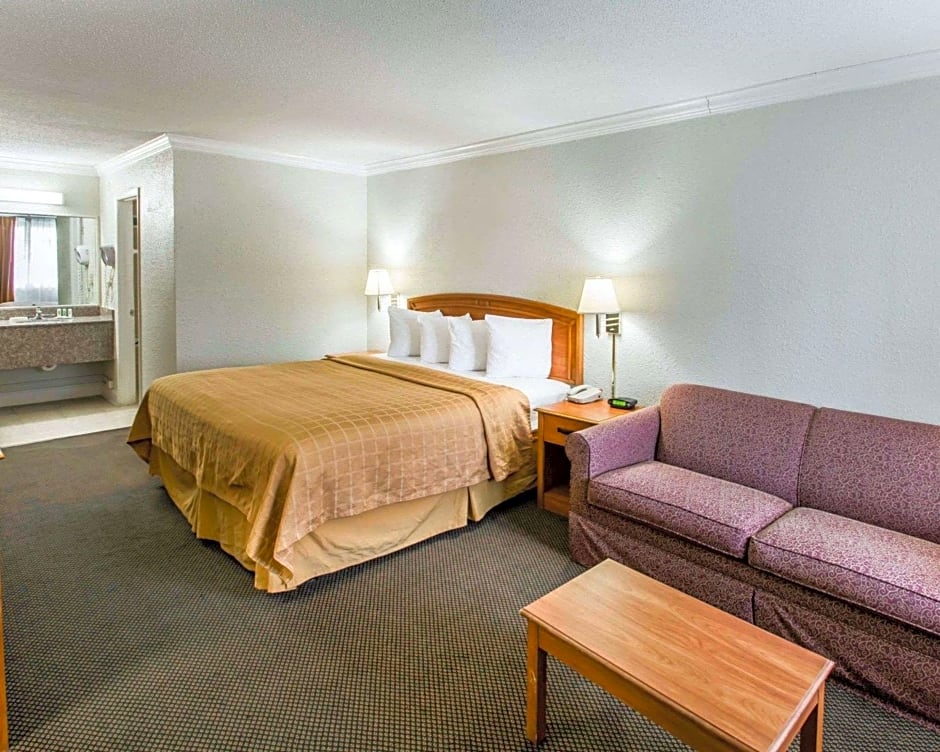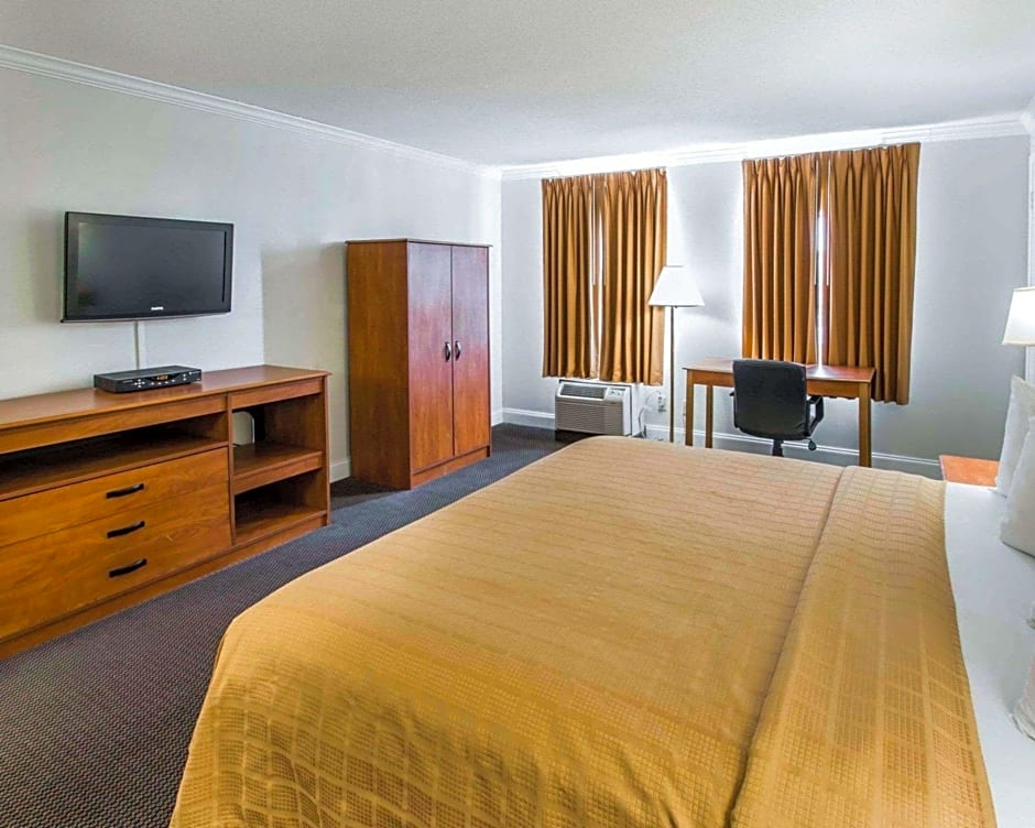 This exterior room features 32-inch flat-screen cable TV, microwave, and small refrigerator. A seating area is also included.