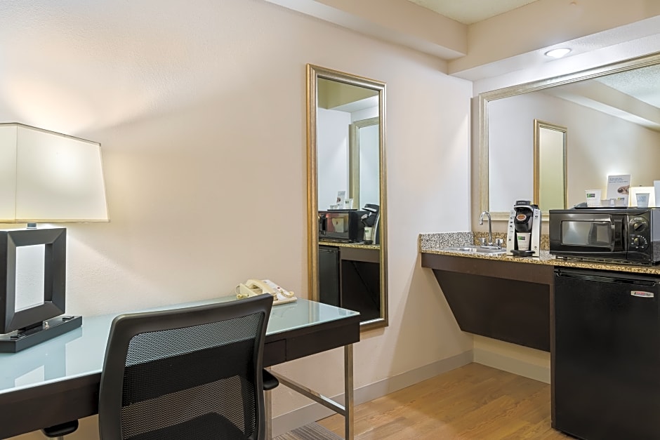 This suite features a microwave, small refrigerator, and seating area with a sofa bed. The accessible bathroom includes a roll-in shower.
