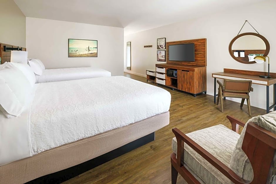 The hotel offers several types of rooms including Queen Rooms with Two Queen Beds and Pool View or Ocean View, King Rooms with Ocean View, Pool View, or for mobility/hearing accessibility, and a standard King Room. All rooms are non-smoking and have a size of 420 sqft. The Queen Rooms accommodate up to 4 adults and 3 children, while the King Rooms accommodate 2 adults and 1 child. The bed sizes vary between 2 Queen size beds for the Queen Rooms and 1 King size bed for the King Rooms.