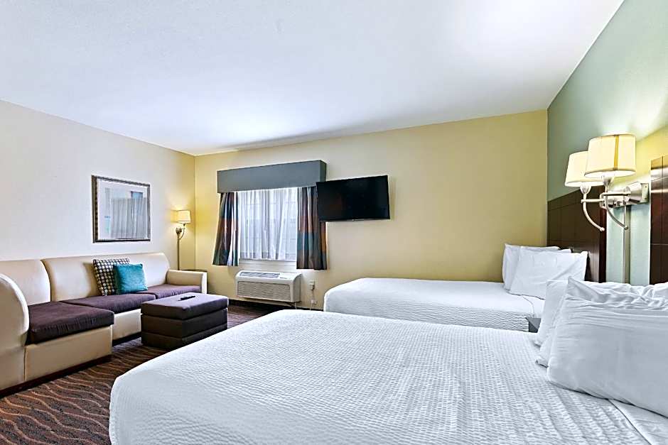 Room configurations cover a range of needs, from Deluxe Studio options—featuring 301 square feet of space and layouts with two doubles, a king, or a queen bed—to a larger Suite, 1 Bedroom at 377 square feet. Each option comes with a kitchenette and kitchenware, a bathtub with free toiletries, and stays non-smoking and air-conditioned. Elevator access helps ease navigation between floors, and these accommodations align well with extended stays or quick getaways alike.