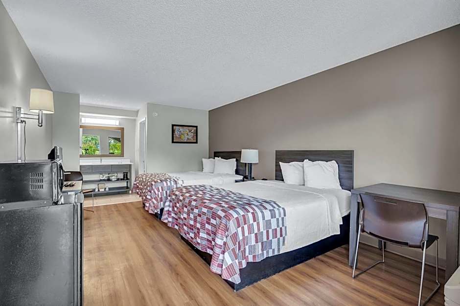 The Red Roof Inn MacClenny offers a variety of room types including Deluxe Rooms with Two Queen Beds (disability access available), Suite King Rooms, and Deluxe King Rooms. All rooms are non-smoking. Deluxe Rooms can accommodate up to 4 adults and 3 children, while Suite and Deluxe King Rooms can accommodate up to 2 adults and 1 child. Bed sizes range from 2 Queen beds in the Deluxe Rooms to 1 King bed in the Suite and Deluxe King Rooms.