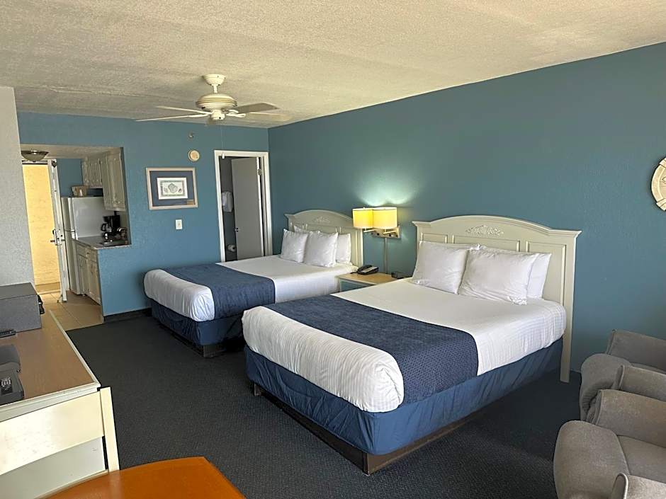 A fully equipped kitchen, dining table, and seating area are featured in this gulf-front studio.