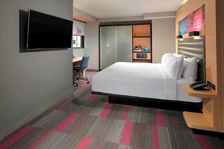 At Aloft Coral Gables, the Ulta Savvy Suite is a spacious room measuring 624 sqft. It can accommodate up to 6 adults and 4 children with 1 sofa bed and 2 queen size beds. Smoking is not allowed in this room. The Aloft Guest Room is a smaller option at 291 sqft, perfect for 2 adults and 1 child. It features a king size bed and is also non-smoking.