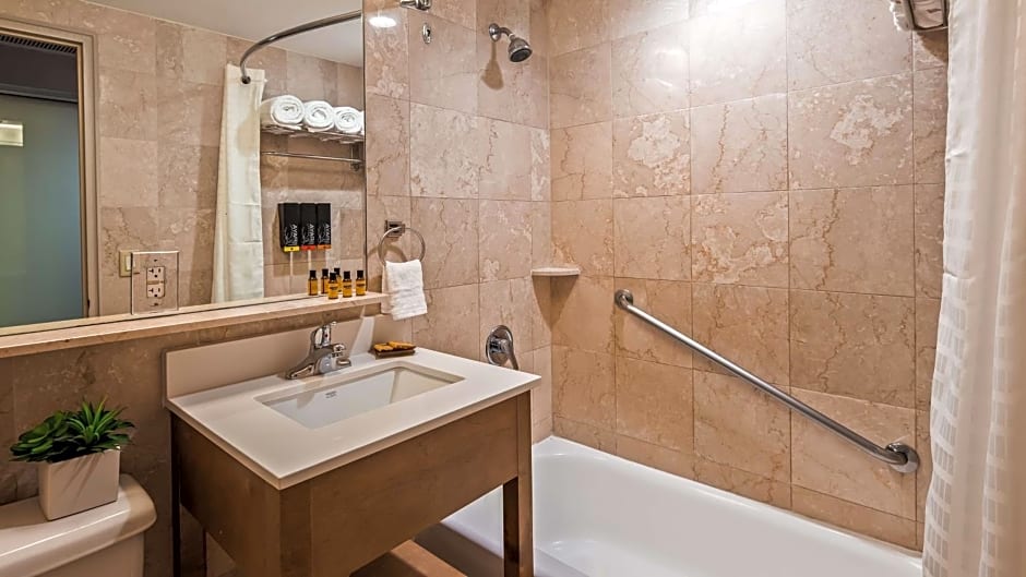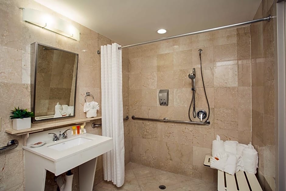 This ergonomically designed accessible room features a coffee machine, 36-inch flat-screen cable TV, and desk. The private bathroom has a roll-in shower.