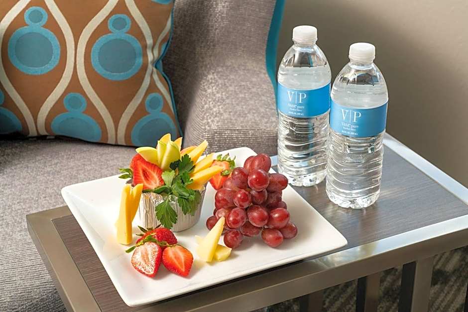 This deluxe room feature amenities including a robe, slippers, and healthy snacks with water. Enhanced high-speed wireless internet is also offered.