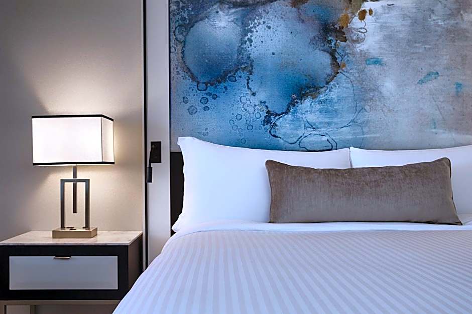 This hearing accessible guestroom includes a city skyline view. A work desk, flat-screen TV and a private, marble bathroom with a walk-in shower.
