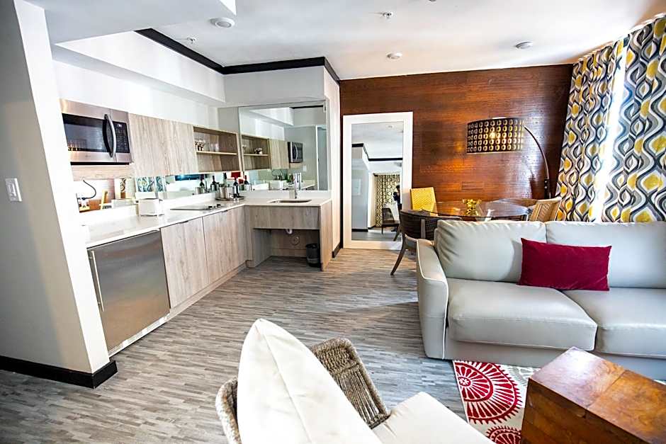 The hotel offers One-Bedroom Suites with a King size bed and a Sofa Bed, accommodating 3 adults and 2 children. Two-Bedroom Suites are also available with 1 Sofa Bed and 2 Queen size beds, accommodating 6 adults and 2 children. The Studio - Disability Access room is a suite with a Queen size bed, accommodating 2 adults. All rooms prohibit smoking.