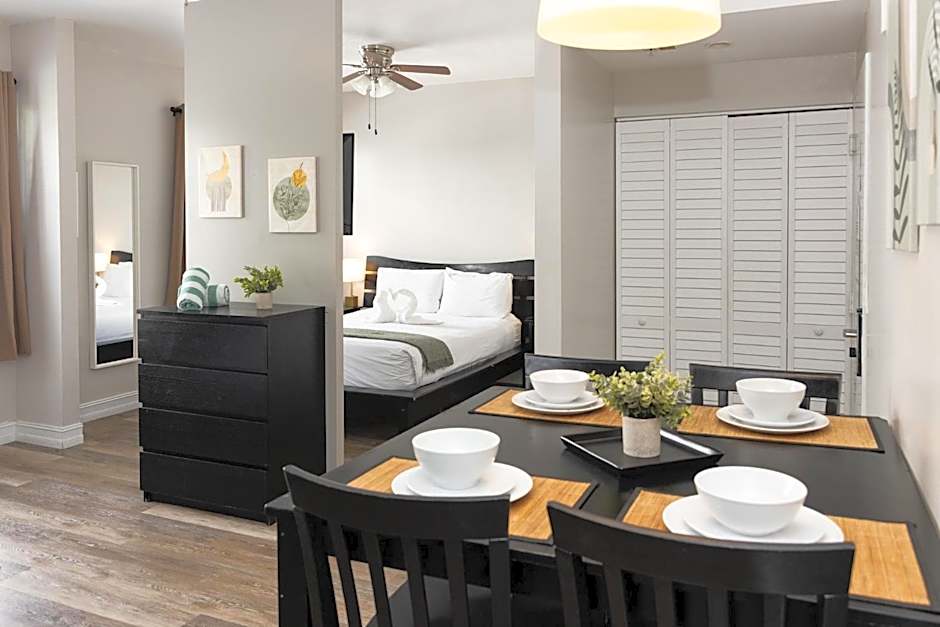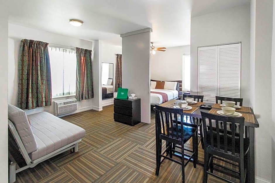This is a 400 sq ft suite, featuring a Queen size bed and sleeper sofa, individually controlled air conditioning, telephone with free local calling, free wireless high-speed Internet access, iron and ironing board, gallery kitchen, microwave, mini-refrigerator, toaster, coffee maker, plates and kitchen utensils, 32 inch plasma TV with 60 channels, art deco bathrooms with tub and shower and daily housekeeping service.