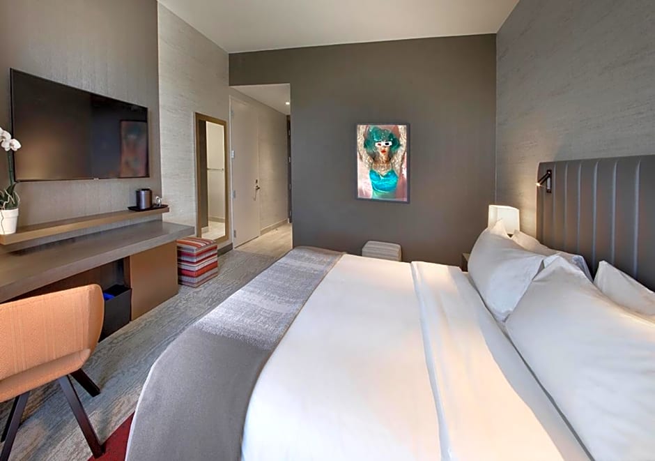 King THesis Waterway view is 344 square feet and includes a king-size bed 150-183 width.