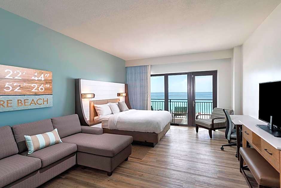 This gulf front suite features a sofa bed and balcony. Additional amenities include a microwave, small refrigerator, and coffee-making facilities.