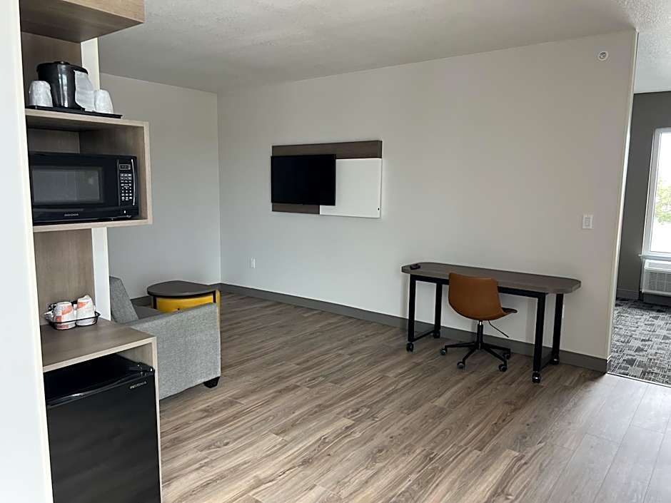 This suite features a tea and coffee maker, a seating area and a TV.