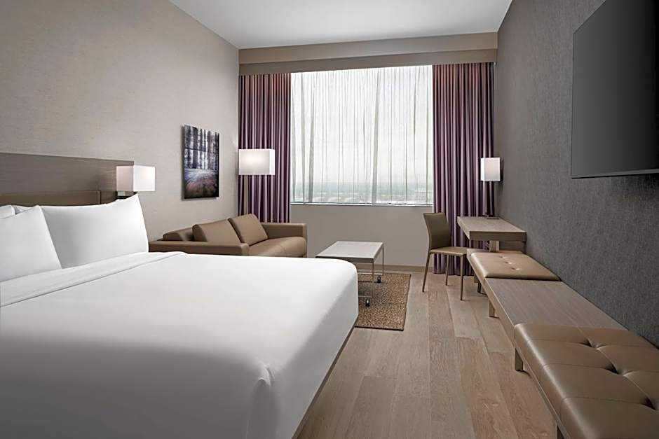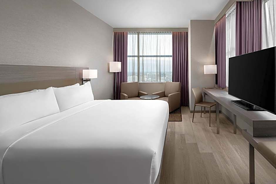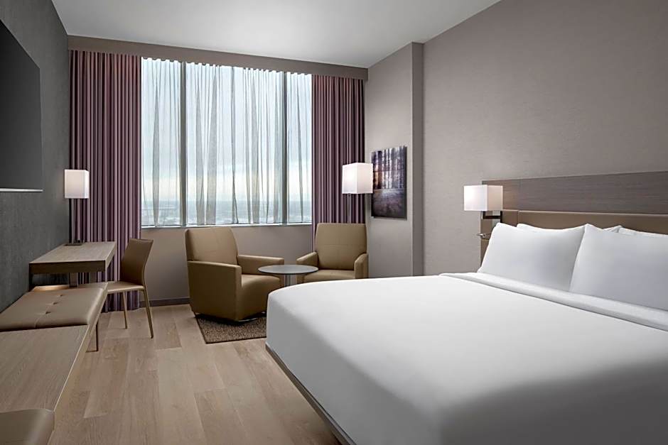 The AC Hotel by Marriott Orlando Downtown offers a variety of room types. These include larger corner guest rooms with 1 king bed, king guest rooms with a sofa bed and city view, queen rooms with city views, and king rooms with city views. Smoking is not allowed in any of the rooms. The occupancy of the rooms ranges from 2 adults and 1 child to 4 adults and 3 children. Bed sizes include king and queen beds. Rooms sizes range from 301 sqft to 377 sqft.