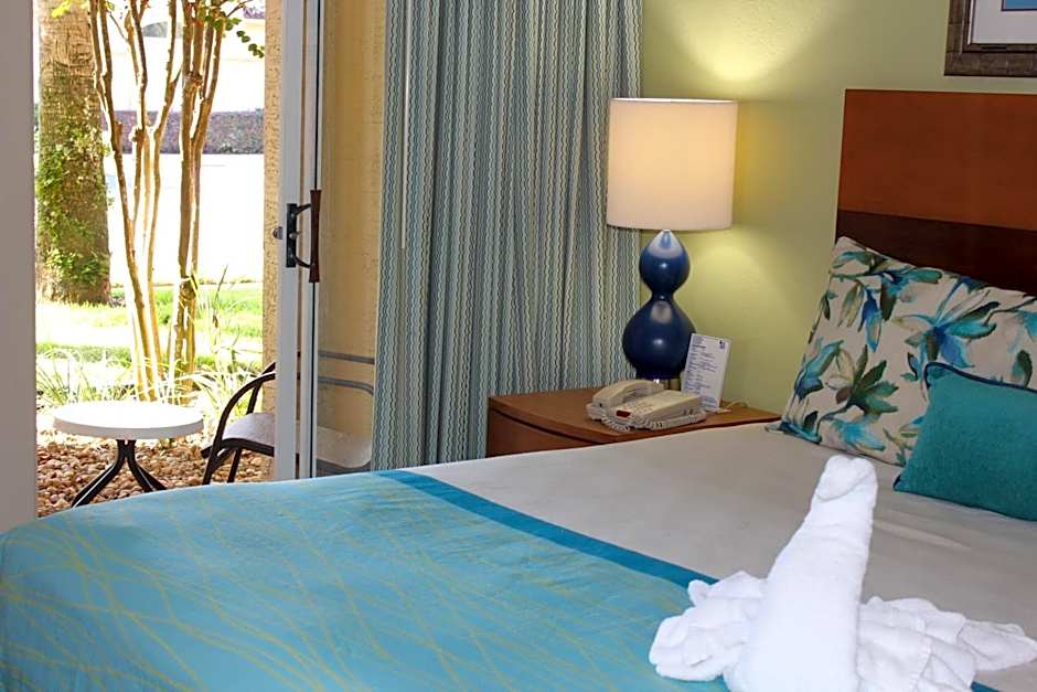 Four outdoor heated pools, all adults-only, invite a year-round poolside unwind. A free shuttle service helps reach nearby sights, and easy access to a golf course adds a touch of resort-style competition. Handy touches include free parking and a fitness center to keep energy up during an Orlando getaway.