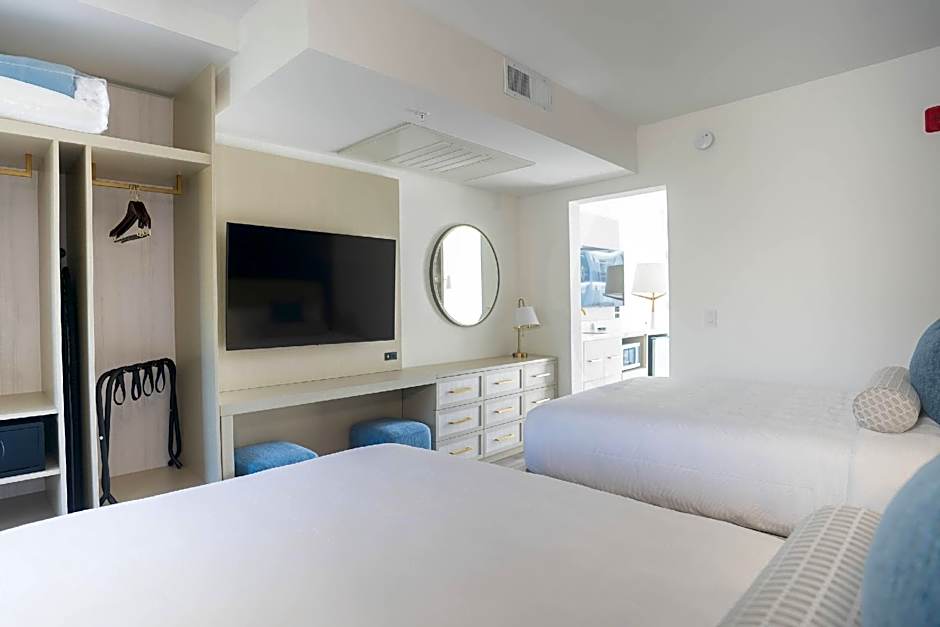 2 Queen Beds, 1 Bedroom Suite, Pool View. Amenities: Microwave, Safe, Free Wi-Fi, Sofa Bed, Living Room, Sitting Area, Pool View, 55-Inch TV, Hair Dryer, Iron and Ironing Board, Table and Chairs, and Mini-Fridge.