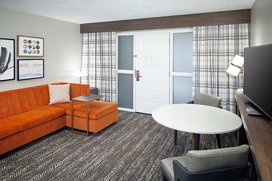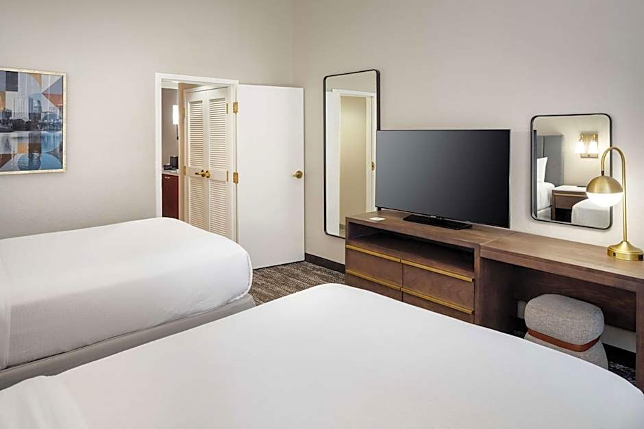 Activity table, sofa bed, microwave, refrigerator, two TVs, complimentary WiFi. This two-room suite features a spacious living room and separate bedroom with two double beds. The comfortable furnishings include a sofa bed, activity table with upholstered chairs, two televisions, a wet bar with refrigerator and microwave oven and accessible bath tub. Each suite, as well as our lobby area, is equipped with complimentary WiFi access. Any corresponding photo may not reflect the specific accessible room type or room feature.