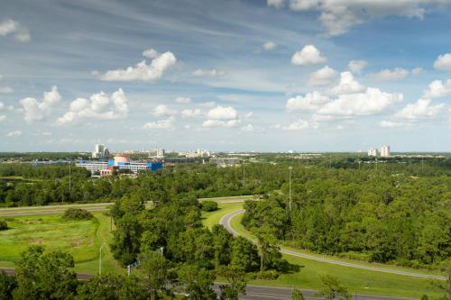 The hotel offers different types of rooms, including Guest rooms and Suites. The rooms have a variety of sizes, ranging from 377 sqft to 775 sqft. All the rooms are non-smoking. The occupancy for the rooms is 2 adults and 1 child. The bed sizes offered include King size, Queen size, and Sofa beds. Some rooms have views of Disney Springs, Poolside, or city views.