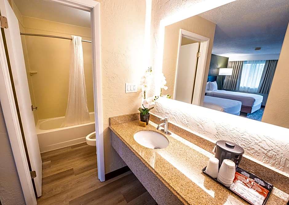 This room features a flat-screen TV, desk, microwave, refrigerator, and coffee machine. The private accessible bathroom includes a bath tub and a hairdryer.