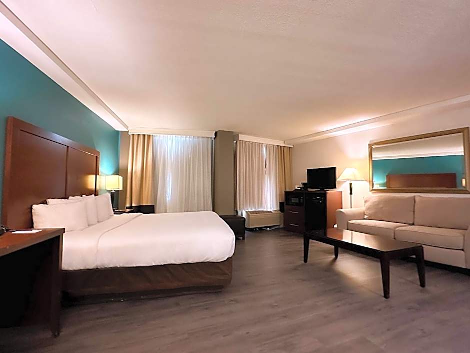 This room features a microwave, small refrigerator, and seating area with sofa bed. A flat-screen cable TV is also included.