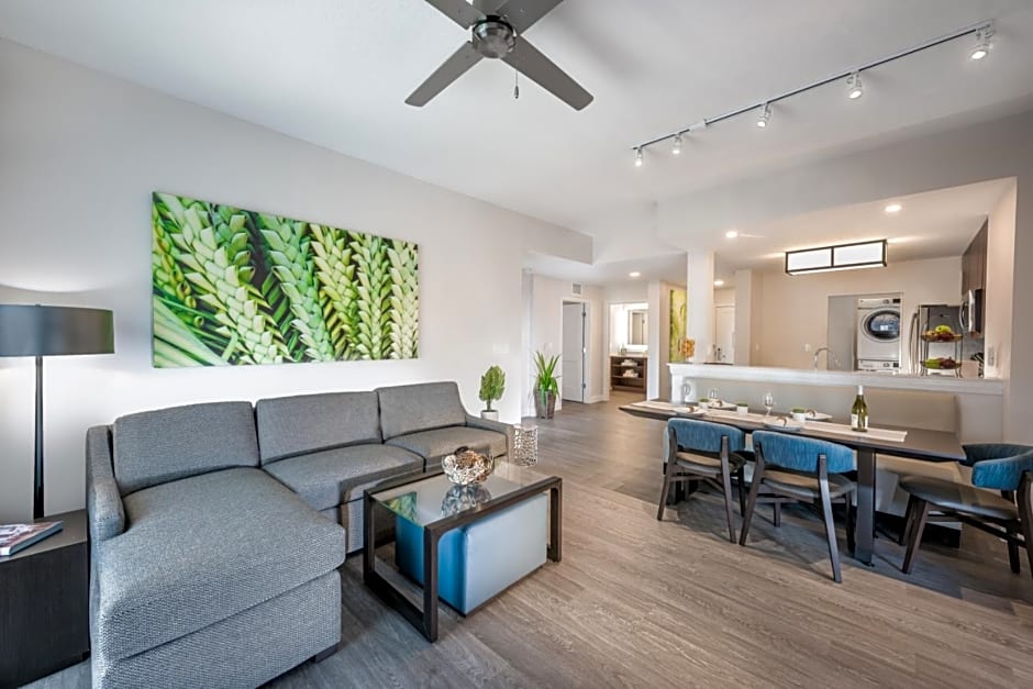 This suite features a view of either Lake Austin, The Springs Pools, the lagoons, or Surfari Water Park. It includes 2 bedrooms, 2 full bathrooms, and a screened balcony. A living room with a sofa bed and dining room are provided. A full kitchen, washer, and dryer are also included.