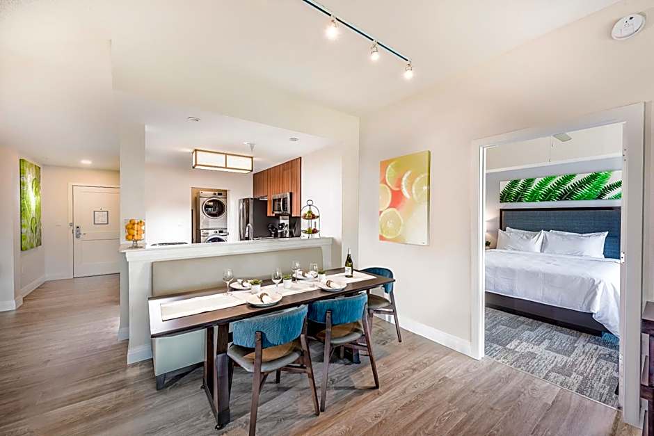 This suite features a view of either Lake Austin, The Springs Pools, the lagoons, or Surfari Water Park. It includes 2 bedrooms, 2 full bathrooms with tubs, and a screened balcony. A living room with a sofa bed and dining room are provided. A full kitchen, washer, and dryer are also included.