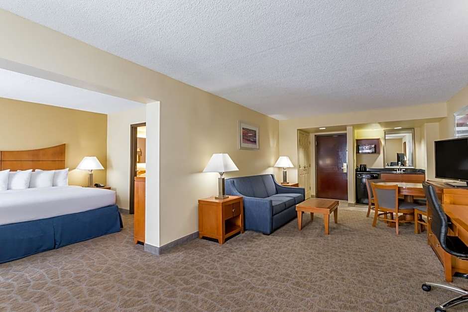 The hotel offers a variety of room options including King rooms with mobility/hearing impaired access, Queen rooms with two Queen beds, King studio suites, and King rooms with a sofa bed. None of the rooms allow smoking and have a similar room size of either 334 sqft or 355 sqft. The rooms can accommodate either triple or quadruple occupancy with bed options including King size beds, Queen size beds, and sofa beds.