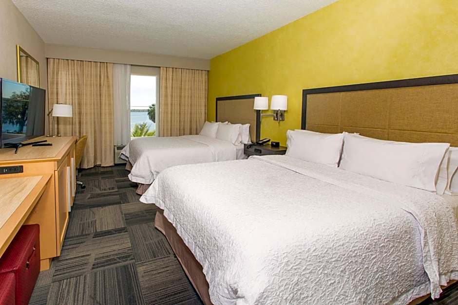 Hampton Inn in Palatka offers a variety of room types, including Queen Rooms with Two Queen Beds, King Studio Suites, and Executive King Rooms. The rooms can accommodate between 2 to 4 adults, and some are suited for families with children. All rooms are non-smoking and feature either King size beds or Two Queen size beds, with options for a river view in some rooms.