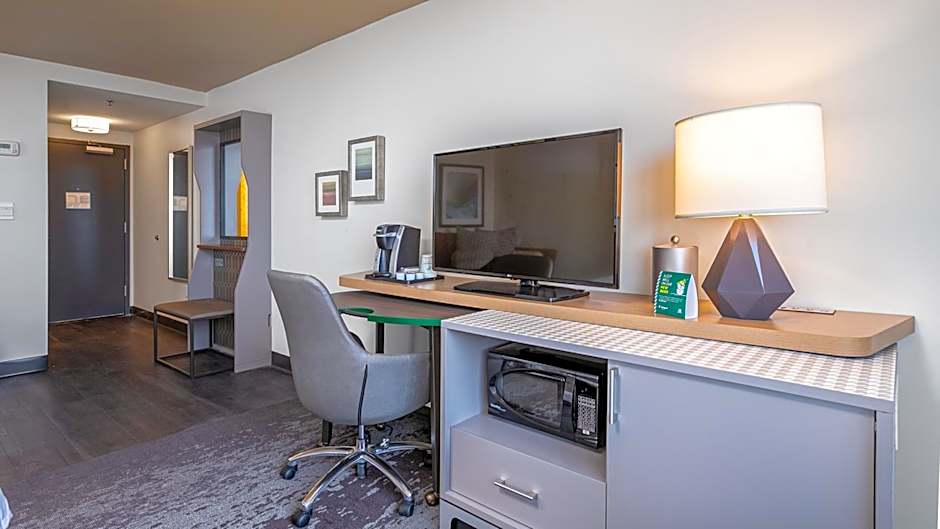 This corner room features a desk, flat-screen TV, desk, microwave, refrigerator and coffee maker. The bathroom comes with a hairdryer, large vanity and walk-in marble shower with glass doors.