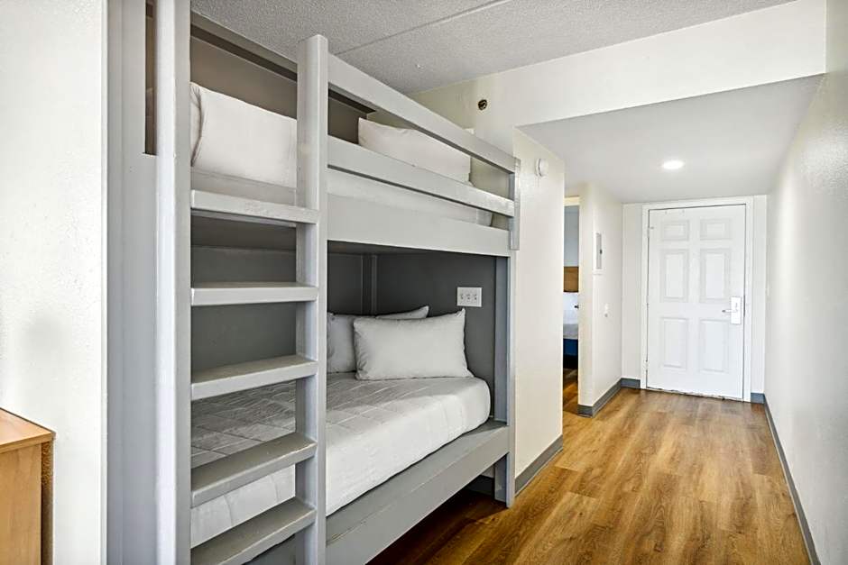 The Sugar Sands Beachfront Hotel offers a variety of room types, including Deluxe Suites with Ocean/Gulf View Beach Walkup, Emerald Suites with Ocean/Gulf View, Deluxe Queen Suites with Ocean/Gulf View, and Suites with Ocean/Gulf View Beach Walkup. All rooms have a size of either 398 sqft or 452 sqft and do not allow smoking. The rooms can accommodate either 4 adults and 2 children or 6 adults and 2 children. The bed sizes range from 2 x Queen size beds to 1 x Bunk bed, 1 x Sofa Bed, and 2 x Queen size beds.