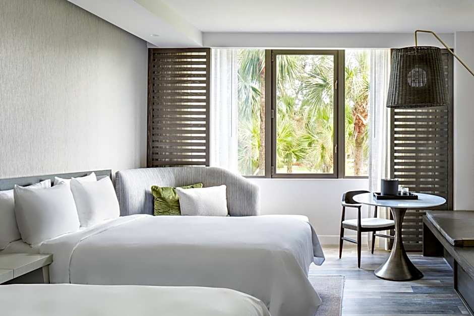 The Sawgrass Marriott Golf Resort & Spa offers a variety of rooms including suites and doubles, with different views such as nature or resort. All rooms are non-smoking. The occupancy for each room is generally 2 adults and 1 child. Bed sizes range from double beds to king-size beds, and room sizes vary from 312 sqft to 807 sqft.