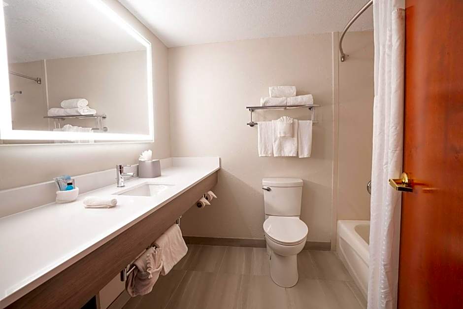 Featuring a 42-inch flat-screen Smart TV, this spacious guestroom includes a refrigerator, microwave, and Keurig® coffeemaker. The private bathroom includes a hair dryer and a bath and shower.