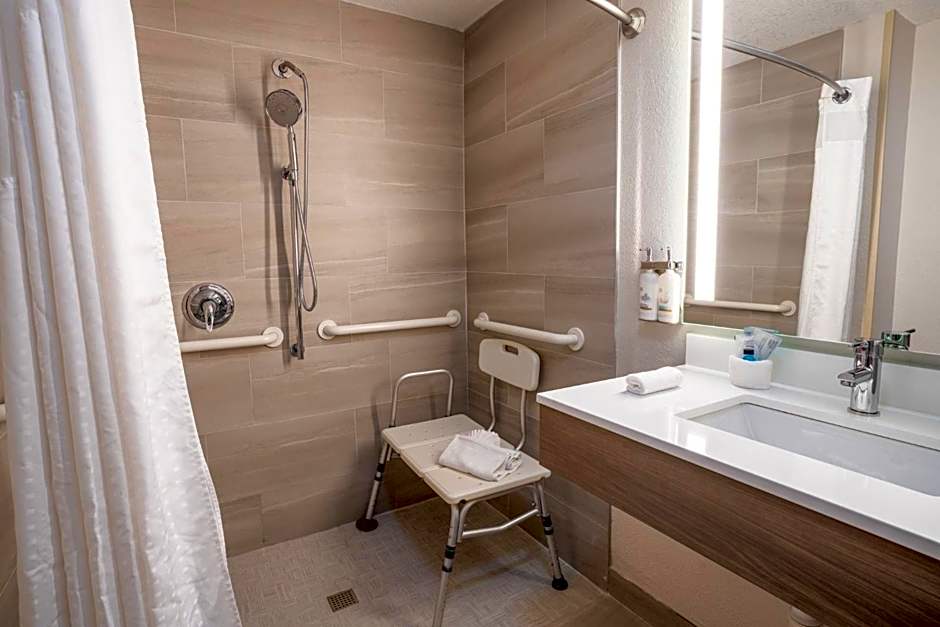 This accessible room includes 36-inch doorways, TTY visual alerts, and roll-in shower with a shower chair and safety bars. A 42-inch HDTV, microwave, and refrigerator are also provided.