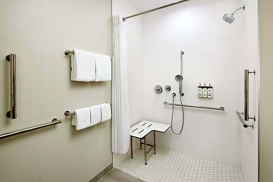 This accessible suite features a microwave and small refrigerator. Visual door and telephone alarms are also included.