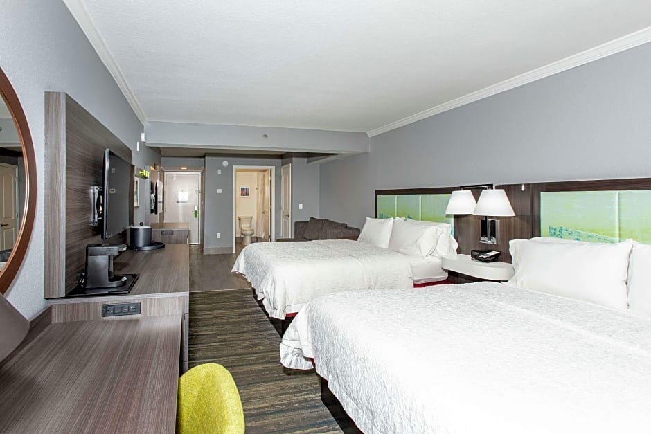 The Hampton Inn Saint Augustine Beach offers several types of rooms. These include King Studio Suites with Whirpool, Queen Studio Suites with Two Queen Beds and Balcony, King Rooms with Disability Access and Roll-In Shower, Queen Rooms with Two Queen Beds and Street View, Non-Smoking Deluxe King Rooms with Balcony, King Rooms with Street View, Queen Suites with Pool View, King Rooms, and Queen Rooms with Two Queen Beds. Smoking is not allowed in any of the rooms. The room sizes range from 301 sqft to 355 sqft. The rooms can accommodate varying numbers of adults and children, with the maximum being 6 adults and 4 children.