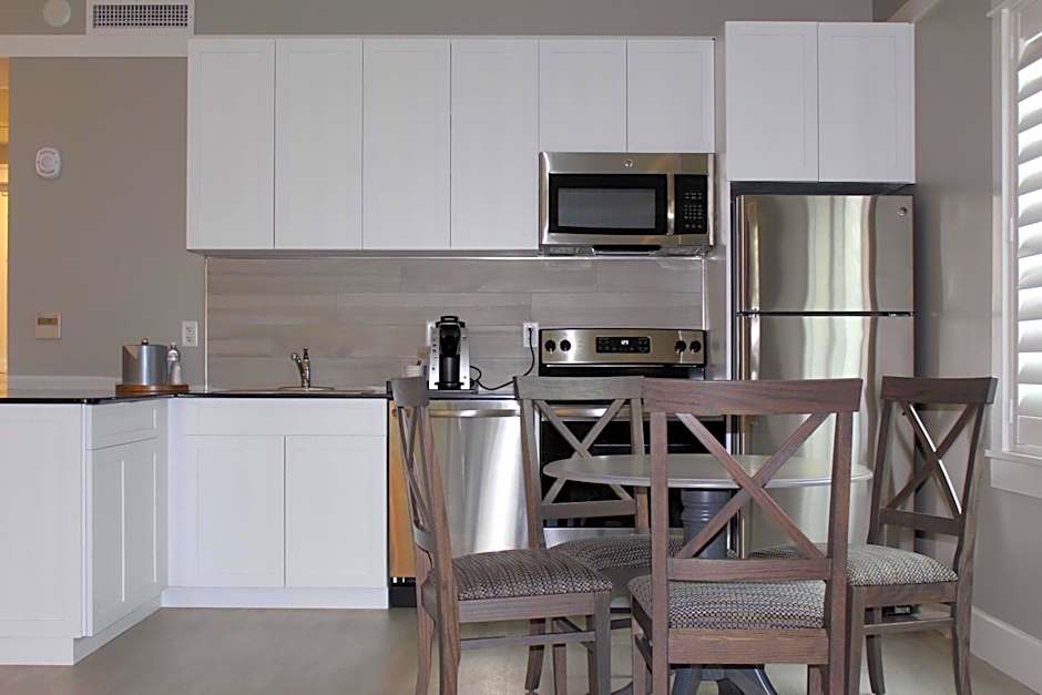 This suite has a seating area with a sofa. The kitchen includes an oven, stove top, and full size refrigerator.