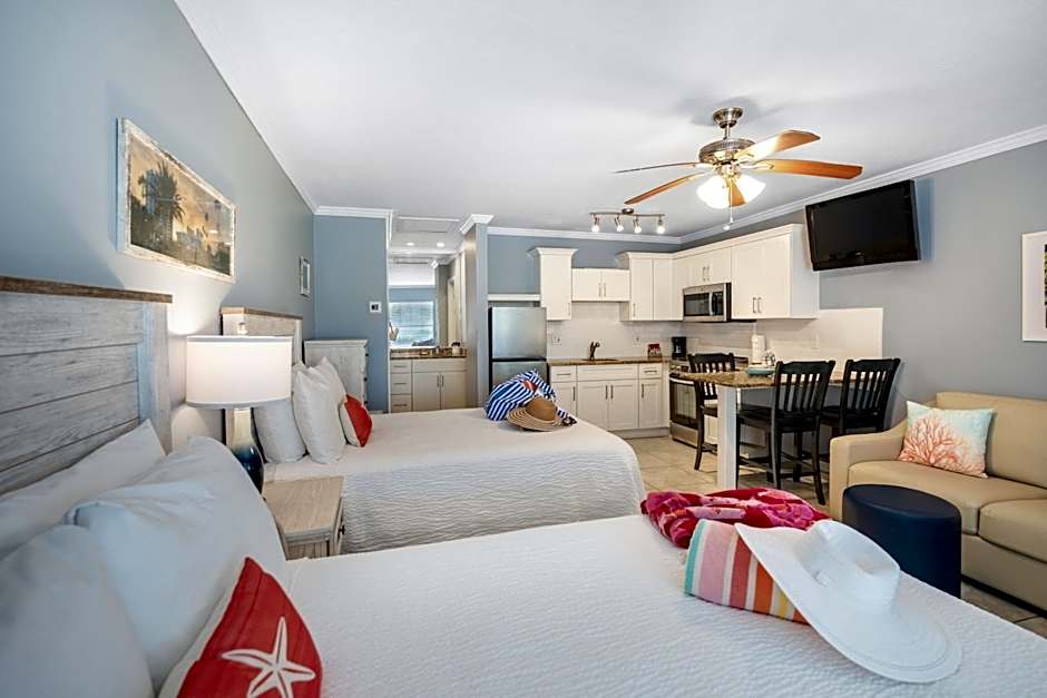 The Tropical Beach Resorts in Sarasota offers a variety of rooms including Studio and Suite options. Most rooms do not allow smoking. Beds range from King to Queen sizes, with some rooms accommodating up to 6 adults and 5 children. Room sizes vary from 215 sqft for a Standard Studio up to 797 sqft for a Two-Bedroom Suite.