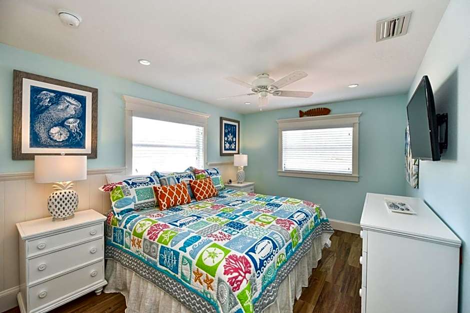 These Over sized 3 Bedroom and 2 Bathrooms Suite are absolutely perfect for your family or travel group. It sleeps 10 people in with King beds in two of the bedrooms, and a Queen over Queen bunk bed in the third bedroom and Queen Sleeper Sofa. This is only 1 of 2, 3 bedroom units available at Tropical Breeze Resort, you can take advantage of the added bedrooms, privacy and space, while still having all of the amenities, furnishings, decorations, location, and customer service that has made us a favorite hotel in the area. Included in your stay is Daily Housekeeping, Free WiFi, Free Parking, Free Beach Chairs and towels, Free Bikes, Free BBQ Grill and Gaming/Community spaces, and so much more. These suites have a large living space, with a kitchen that includes a high bar top for additional seating and entertaining. They also have a large living room. Finally, located directly in the middle of Siesta Key, right in between the Village and the Beach so everything is within a short walking distance. These suites are perfect for a weekend getaway, week long vacation, or any type of stay and feature Free WiFi and Cable TV, but who wants to be inside when you're in paradise. Walk to any of our 2 Heated Community Pools and 1 Heated Spa just 1-1.5 blocks away. Or, talk to our staff about things to do in the area. Don't forget to check out our Events Calendar for all the fun things coming up, like wine tastings, sunset events, various game tournaments, kids scavenger hunts, arts and crafts, and more. There are so many features and amenities here when you decide to stay with us. As I stated, this is a 4 plex building, and there are 3 other units in this building - another 3 bedroom Unit, a Studio Suite, and a 1 Bedroom Suite; so bring all of your friends and stay in this 4 plex together.
