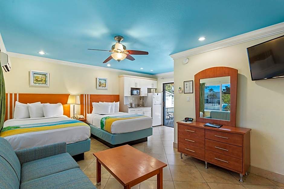 Two double beds and one sleeper sofa. Standard view - no water view. Completely renovated over-sized studio suite offering full kitchen, stovetop, microwave, full-sized refrigerator/freezer, coffee/tea maker, and kitchen place settings. Individually controlled air conditioning, ceiling fan, non-smoking room, premium Wi-Fi, LED TV, electronic safe, hairdryer, iron and ironing board, direct-dial phones with free local calls. Exterior-corridor with a sitting area outside room.