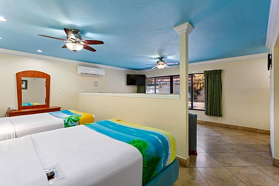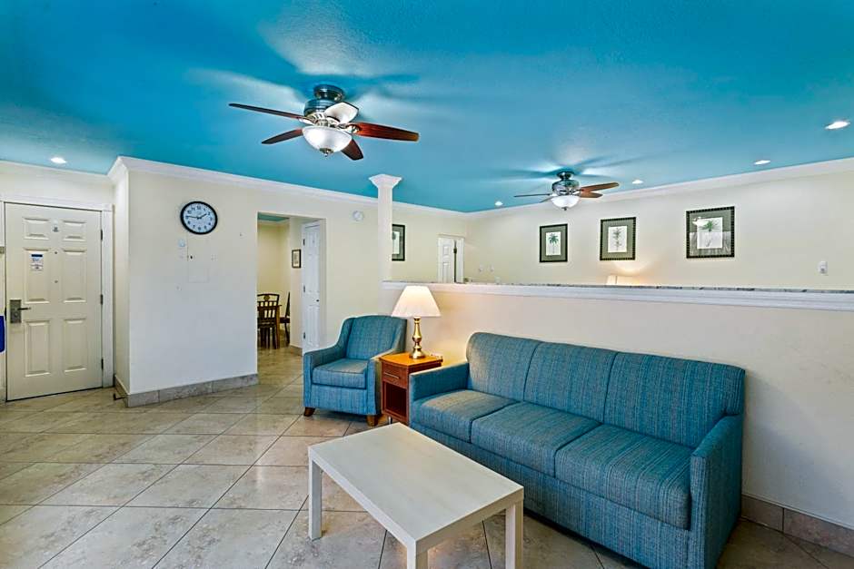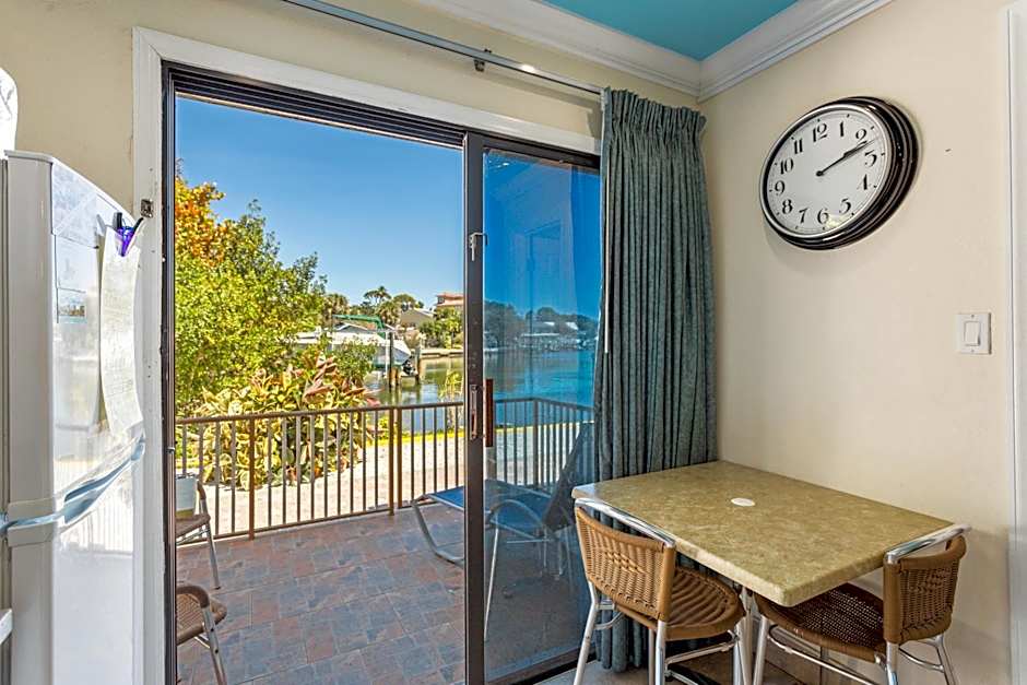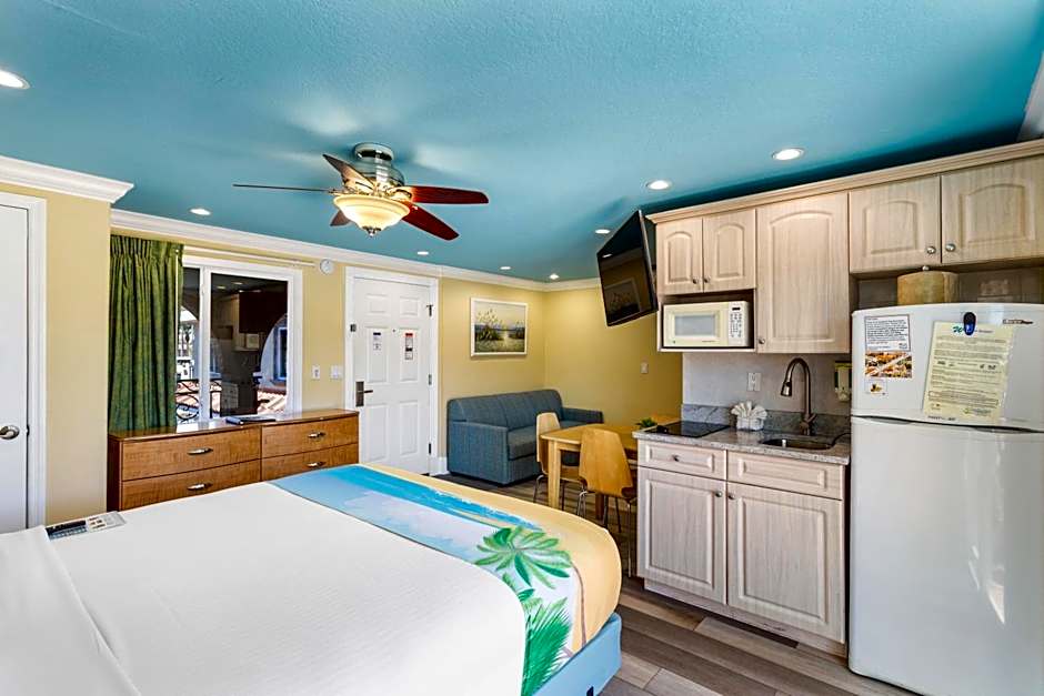 This suite features a bay-front view with a sliding glasses door overlooking the Intercoastal Waterway. Guests can also enjoy an enclosed balcony patio, full kitchen, and flat-screen television. The suite may be located on the 1st or 2nd level.