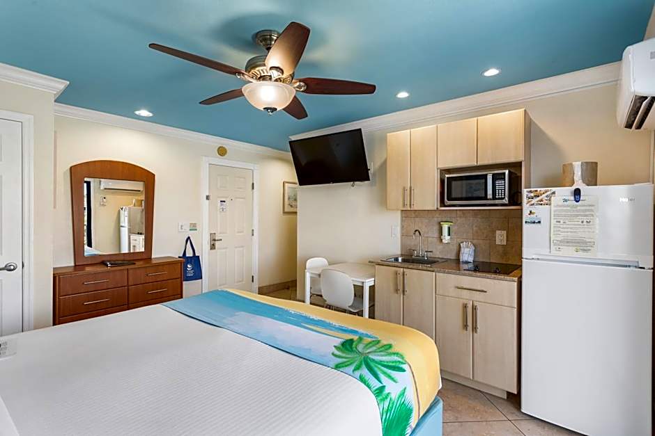 This efficiency has a bedroom separate from the living area by a half-wall partition. Guests can expect a land view, full kitchen, and sofa bed. The suite faces the exterior hall and has a sitting area outside. A flat-screen TV is also included.