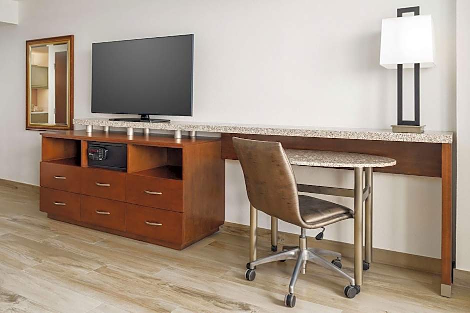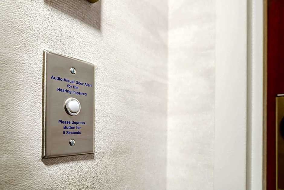 This king room includes an accessible bath, small refrigerator, and a flat-screen TV.