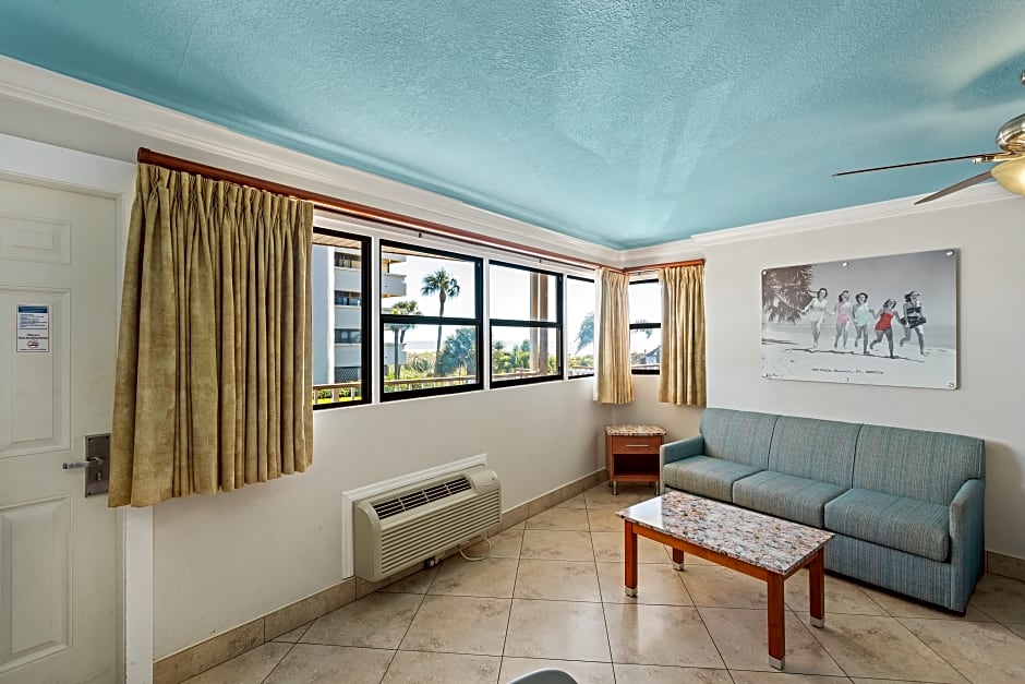 Two queen beds and one sleeper sofa. Superior Gulf view along side of hotel - second floor. Completely renovated over-sized studio suite offering full kitchen, stovetop, microwave, full-sized refrigerator/freezer, coffee/tea maker, and kitchen place settings. Individually controlled air conditioning, ceiling fan, non-smoking room, premium Wi-Fi, LED TV, electronic safe, hairdryer, iron and ironing board, direct-dial phones with free local calls. Exterior-corridor with a sitting area outside room.