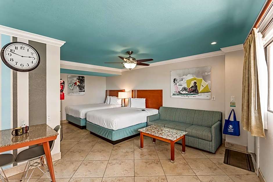 The Plaza Beach Hotel - Beachfront Resort offers a variety of room types including suites and double rooms. The Superior Gulf View Suite has 2 Queen Beds and 1 Sofa Bed, accommodating 6 adults and 4 children. The Roadside Efficiency room has 1 Queen Bed and accommodates 2 adults. The Deluxe One Bedroom Suite has 2 Queen Beds in the bedroom and 1 Sleeper Sofa, accommodating 6 adults and 3 children. The Deluxe Efficiency Suite also has 2 Queen Beds and 1 Sleeper Sofa, accommodating 6 adults and 4 children. None of the rooms allow smoking.