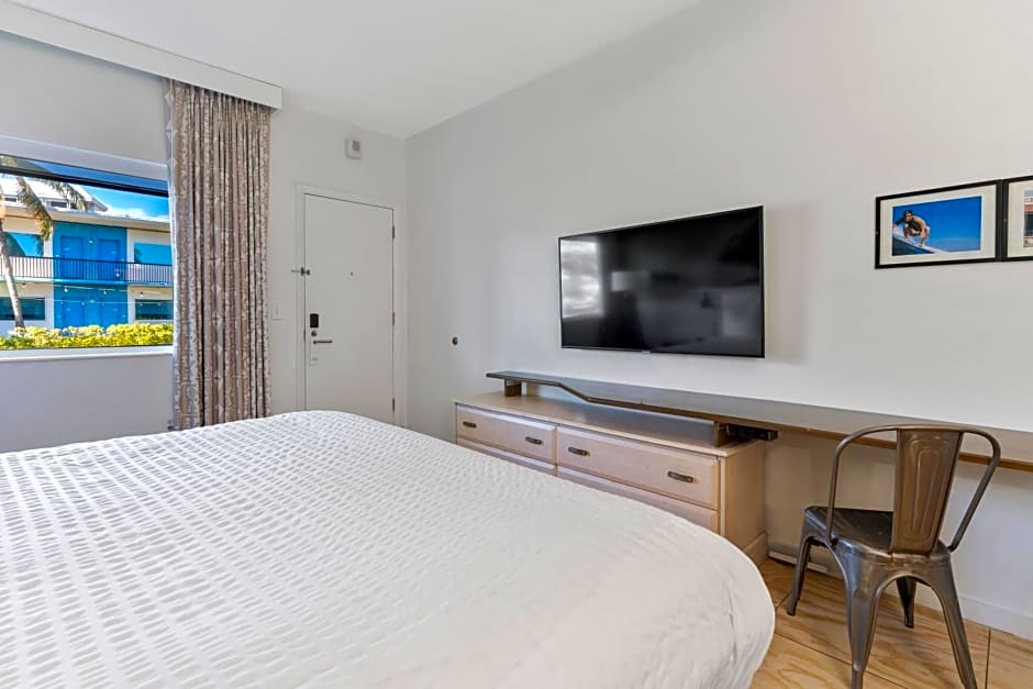 Stepping into your beach oasis you are greeted by a full wall surf mural and fresh white linens which create the beach in your room. Newly renovated bathroom and bedding. These rooms are located on the exterior side of the property convenient to parking and away from the action if you prefer it quieter.