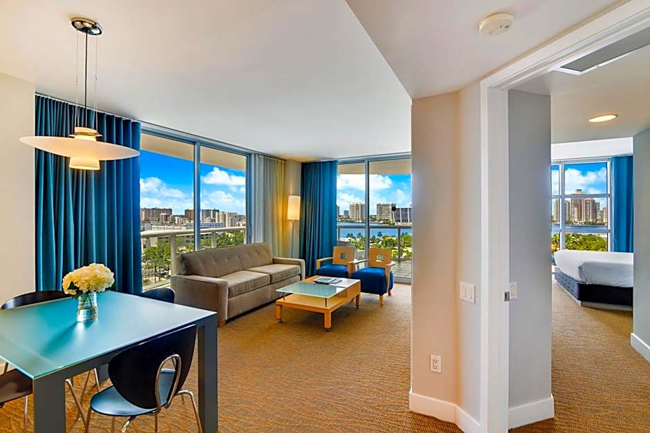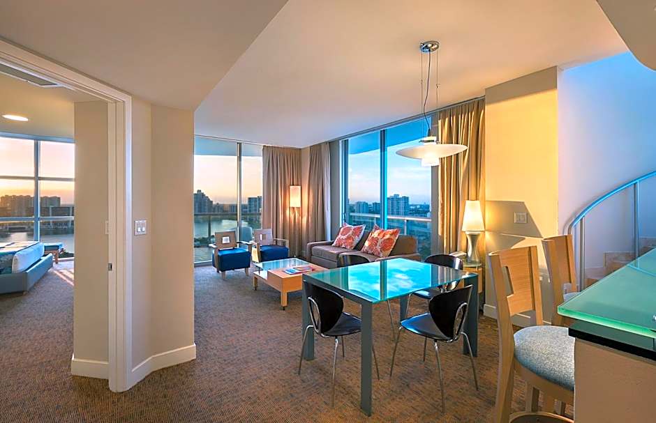 This suite features floor-to-ceiling windows and a balcony, both with views of Biscayne Bay and the Atlantic Ocean. The separate bedroom includes an private bathroom with marble tile. An additional bathroom is provided as well as a fully equipped kitchen, dining area, and living area.