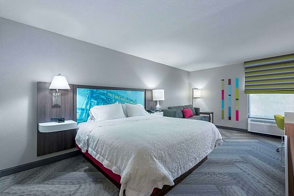 Free WiFi access, refrigerator, microwave, HDTV, sofa bed, large desk, coffeemaker Settle into this spacious non-smoking room which features one king-sized clean and fresh Hampton bed® and a queen-sized sofa bed for extra guests. Relax and watch a movie on the 32-inch HDTV or work at the desk and stay connected with free WiFi access. Other convenient amenities provided include a coffeemaker. The bathroom offers plush towels and a shower with a Waterpik® showerhead and curved shower rod that allows extra light and space in the shower.