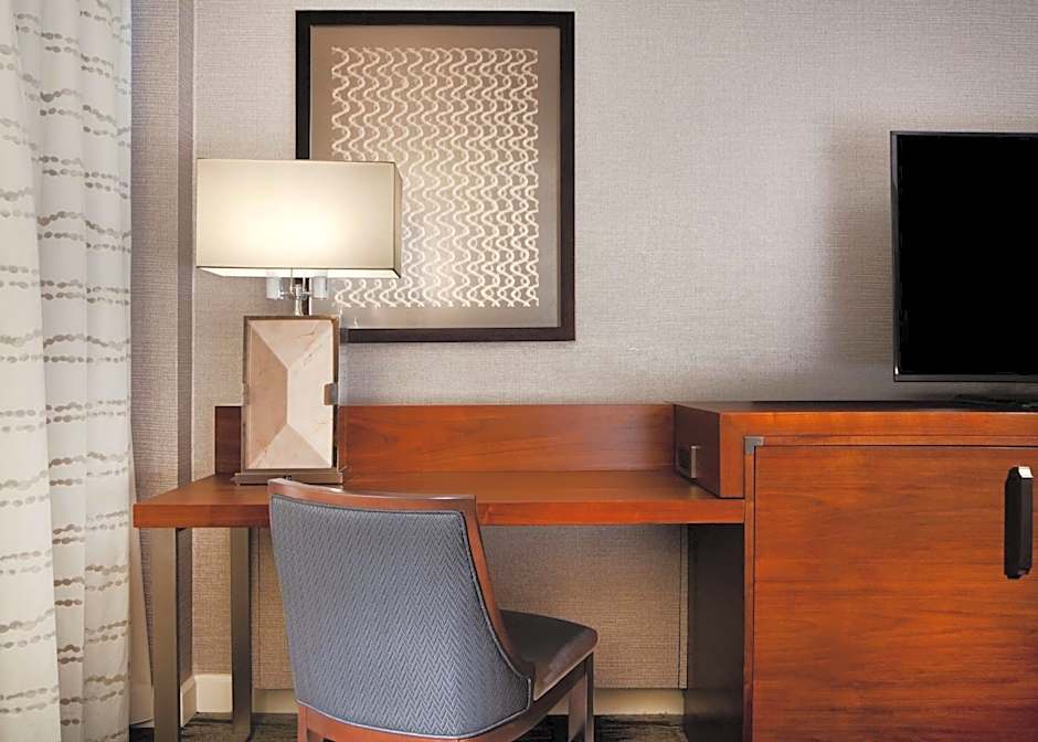 This hearing-accessible room includes cable TV and a work desk.